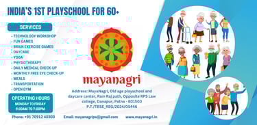 At MayaNagri, we believe that aging should be celebrated, not endured. As India's first-ever Playschool for Senior Citizens, we aim to redefine the way society views and experiences old age. Unlike traditional senior care facilities, MayaNagri is a vibrant, energetic space where seniors are encouraged to live each day with joy, laughter, and adventure.